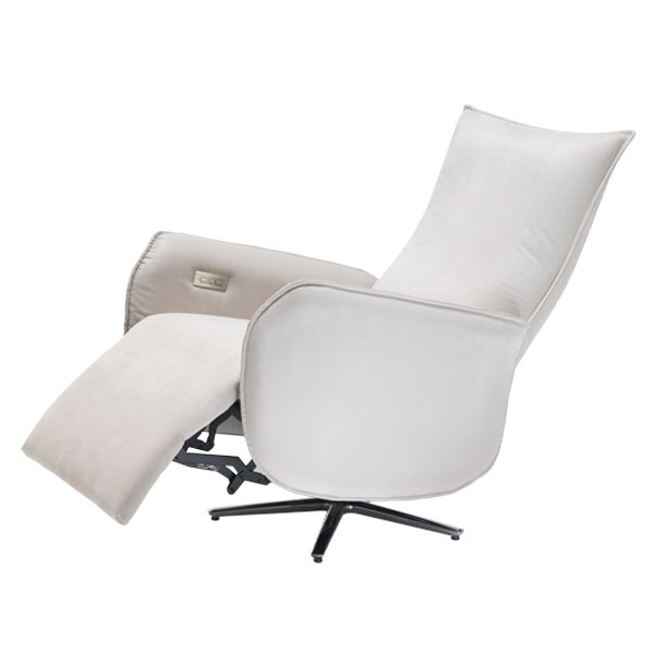 Poltrona girevole realizzabile su meccanica elettrica o manuale. Poggiatesta regolabile manualmente. Struttura del fusto in legno e meccanica in acciaio verniciato. Imbottitura in poliuretano espanso a densità differenziata. Base girevole in acciaio. Meccanica dotata di batteria ricaricabile che ne consente l’uso in ogni punto della stanza (circa 60 cicli di autonomia). Rivestimento a scelta con tessuti di alta qualità e vasta gamma colori.